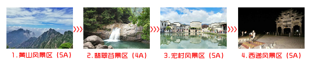 第1天:黃山風(fēng)景區(qū)--->第2天:黃山+翡翠谷景區(qū)--->第3天:西遞+宏村景區(qū)